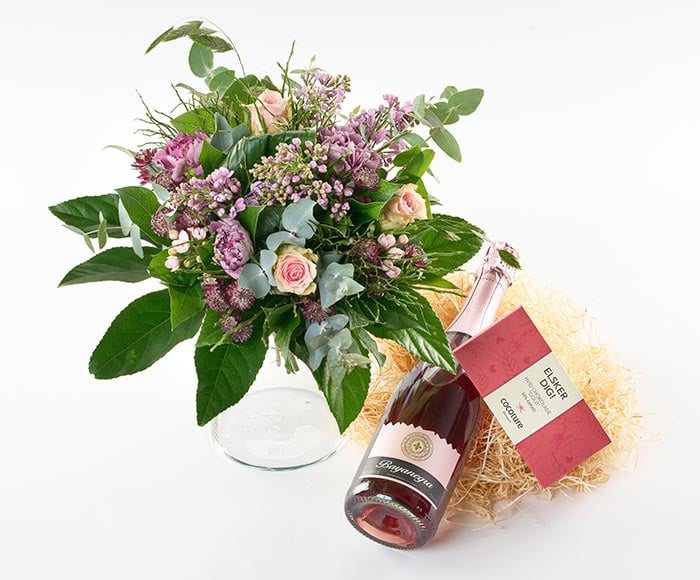 Vis din kærlighed med denne romantiske gavepakke, der kombinerer en smukt håndbundet buket og nøje udvalgte delikatesser. Buketten er bundet af erfarne florister med sæsonens friske blomster og afspejler en harmonisk blanding af farver og elegance, der pa