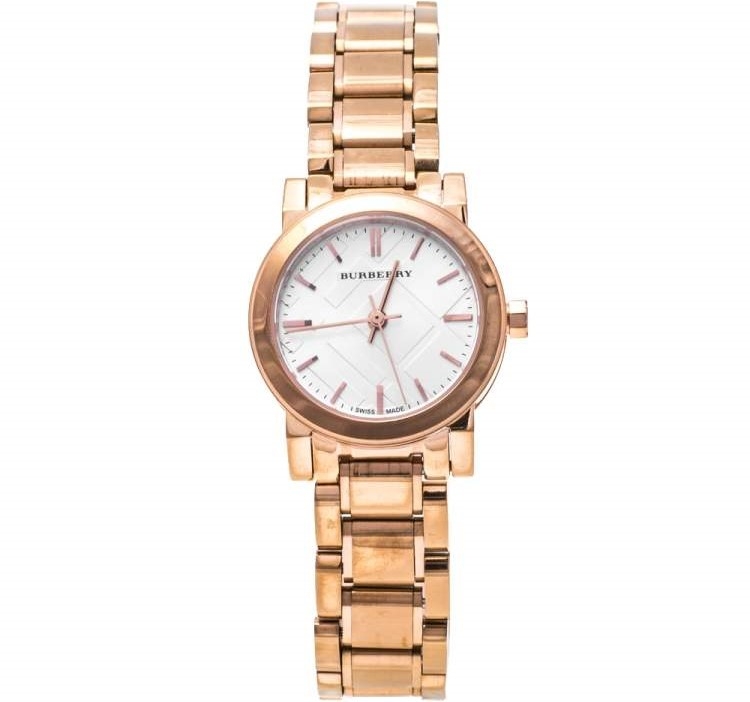 Køb Burberry “The City” Rosegold ur til damer med gratis fragt.BURBERRY “The City” er seriens mindste urmodel med en urkasse på 26mm og kun 7mm tykkelse. Urkasse, urkrans og krone er alle rosegold farvet med et fint indgraveret BURBERR