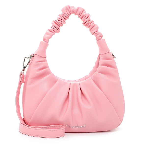 Bianca skuldertasken fra Emily & Noah er en lille skuldertaske lavet i smukt skønt rosa kunstmateriale. Dametasken har en smuk stilfuld rynket hank samt et trendy design. Tasken har en let bananform og en retro stil, der gør de