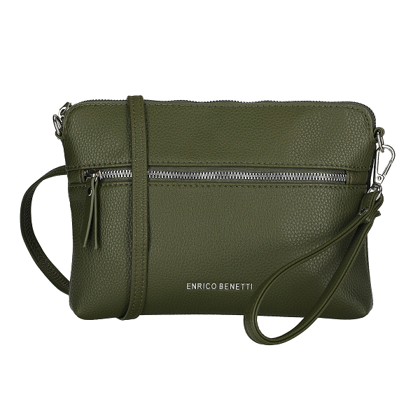 Enrico Benetti Sarah Clutch er en klassisk og elegant dametaske, designet i olivengrøn nubret kunstlæder, der kombinerer funktionalitet og stil. Tasken er perfekt til både fest og hverdagsbrug, da den har et alsidigt design, der passer til