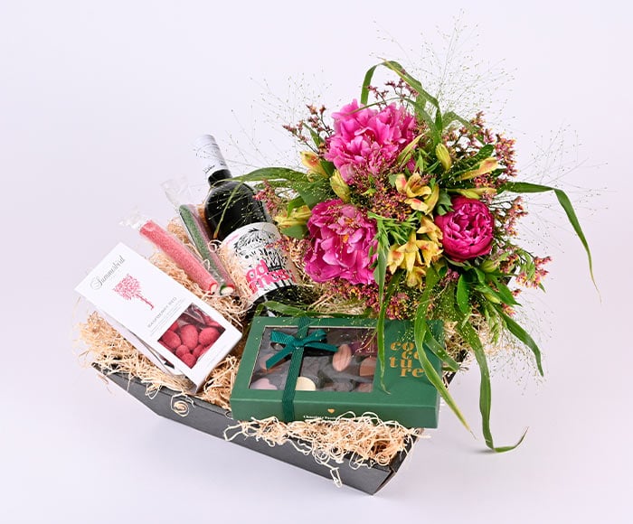 Overrask med en gave, der kombinerer elegance og smag – gavekassen med buket og delikatesser er perfekt til enhver anledning. Gavekassen indeholder en smukt håndbundet blomsterbuket sammensat af sæsonens friske blomster og en række nøje udvalgte delikat