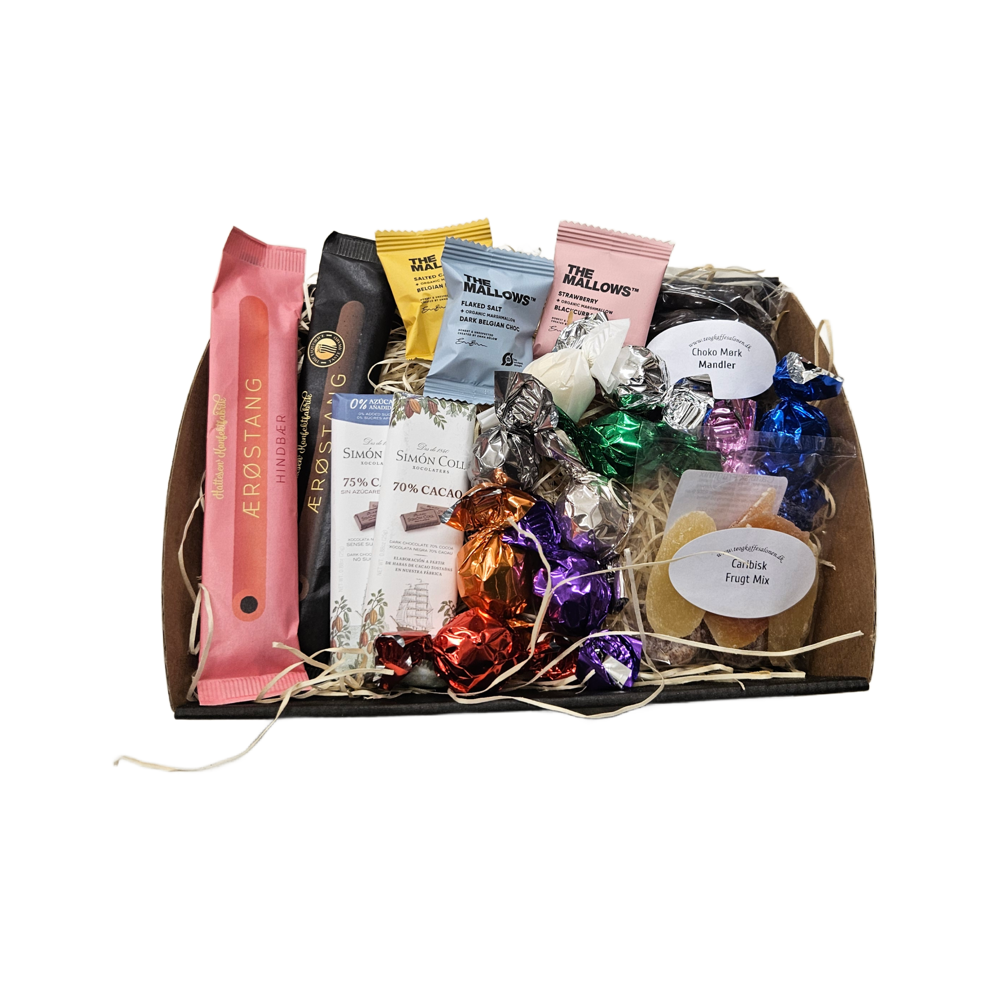 2 x hattesens lakridskonfekt ærøstænger Simon coll 70% mini chokobar Simon coll 75% mini chokobar 3x the Mallows mini Caribisk frugt mix Choko mørk mandler 10x chokolade kugler