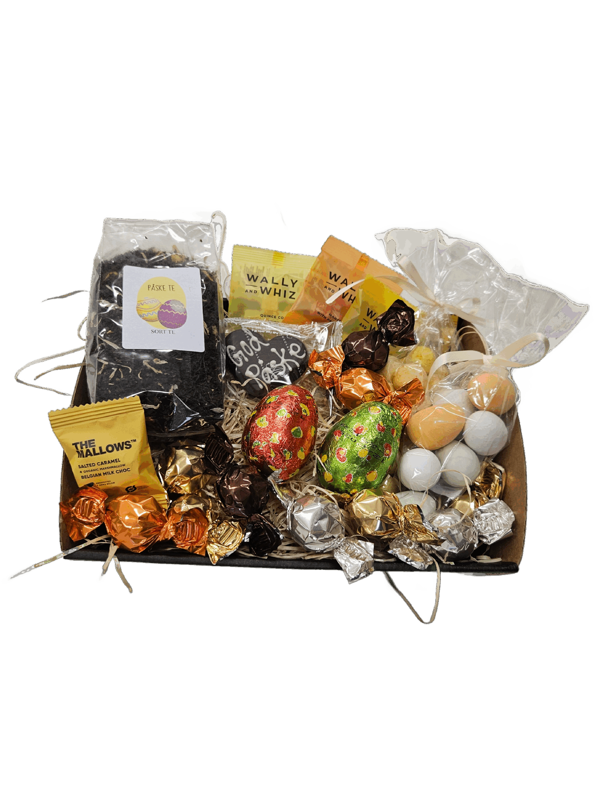 Sort påske te Marcipan hjerte med tekst- god påske 3 x wally and whiz flowpack 100 g slik pose – påskeæg 100g Lakridskugler m hvid chokolade og passionsfrugt pulver 10 x chokoladekugler 2 x Simon coll hule chokoladeæg