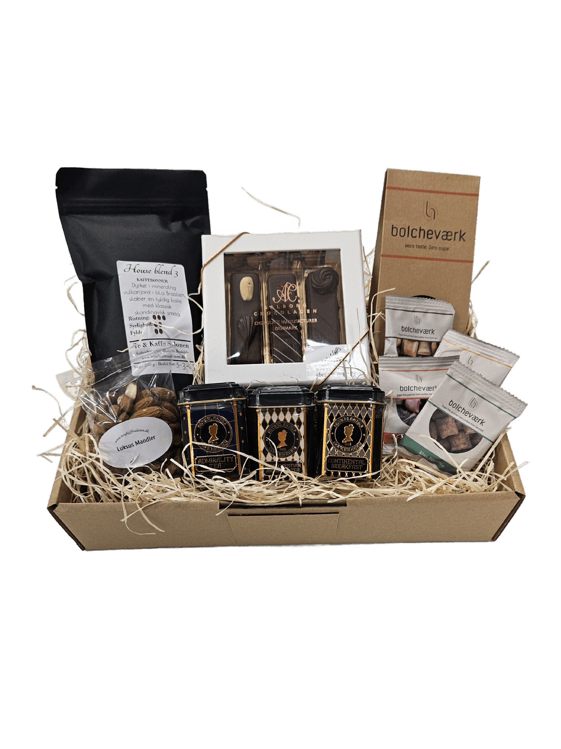 200g kaffebønner (kan males) Ca. 100g luksus mandler 3 x Østerlandsk te i dåse (18g) Bolcheværk 100g sukkerfri bolche æske + 4 flowpack Aalborg Chokolade 3 stk blandede marcipanstænger sukkerfri