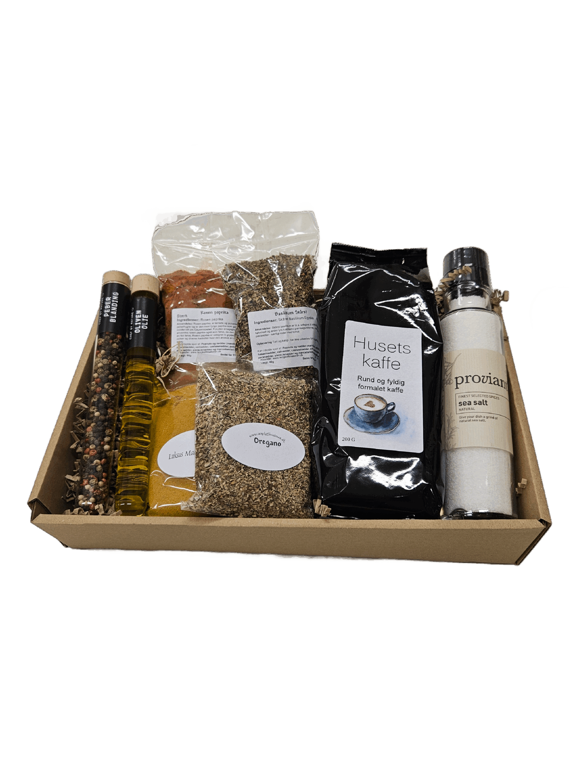 Proviant sea salt 200 g husets kaffe 40g skåret basilikum 90g Rosen paprika 90g Luksus madras karry 20g Oregano Chef by nature Oliven olie Chef by nature peber blanding