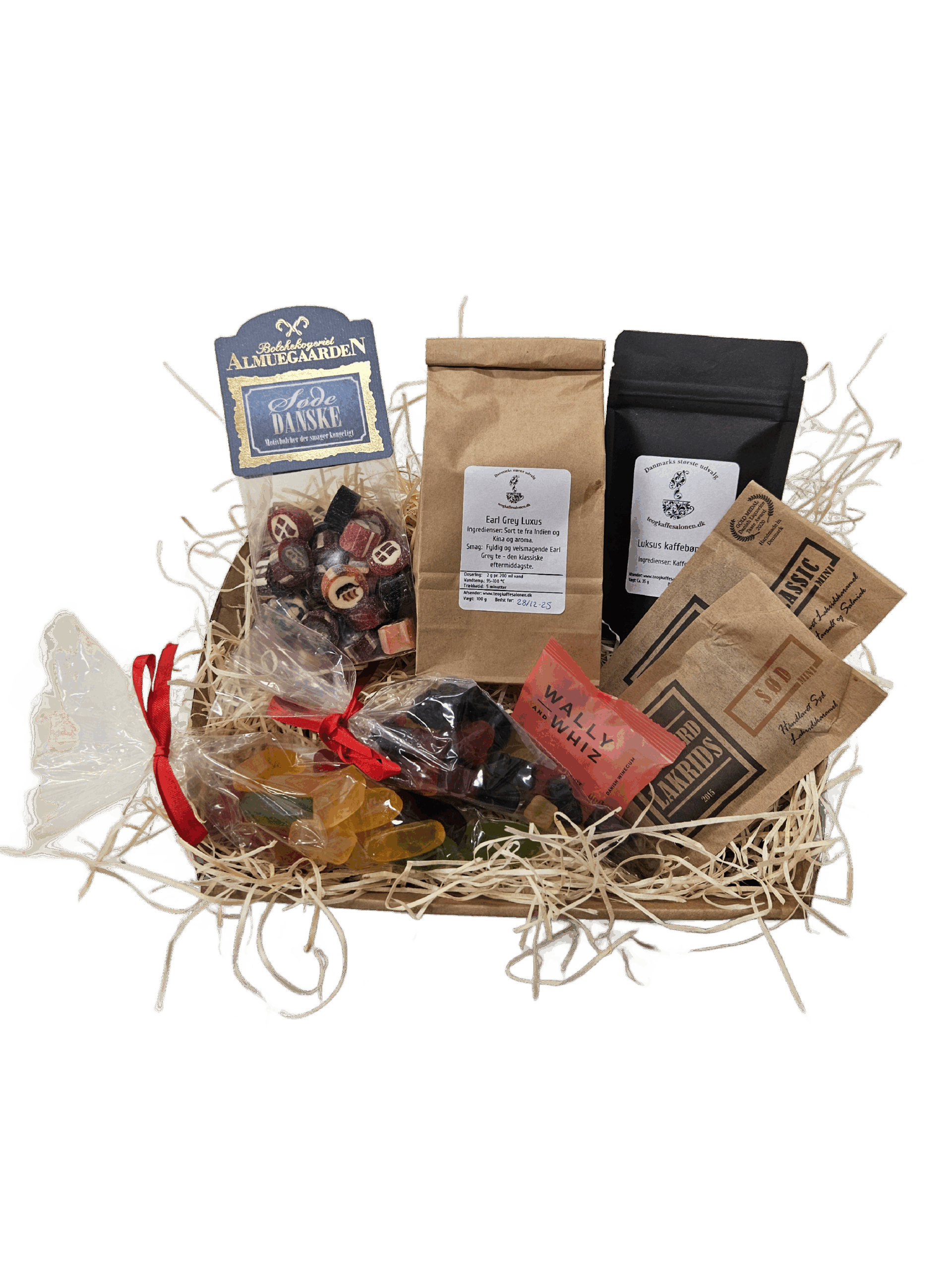 100 g te 2 x Bagsværd lakrids mini 2 x 100g slikpose Almuegaarden bolcher Luksus kaffebønner mini Wallyandwhiz flowpack