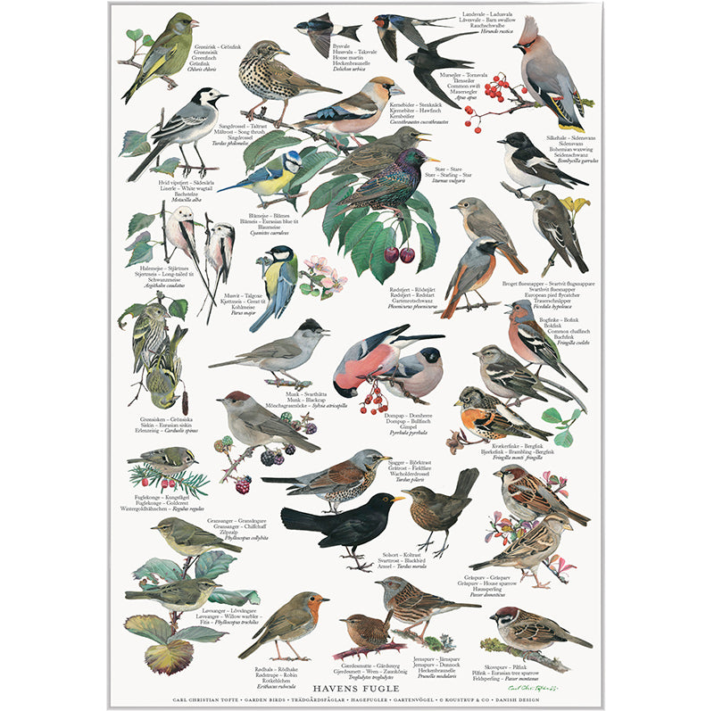 Havens Fugle – Plakat A2 Natur plakat med flotte tegninger af havens fugle. Det er ret hyggeligt at følge med i dyrelivet hvor man bor, men hvem er det egentlig der besøger ens have? eller måske spise ved foderbrættet? På denne plakat finder du flotte ill