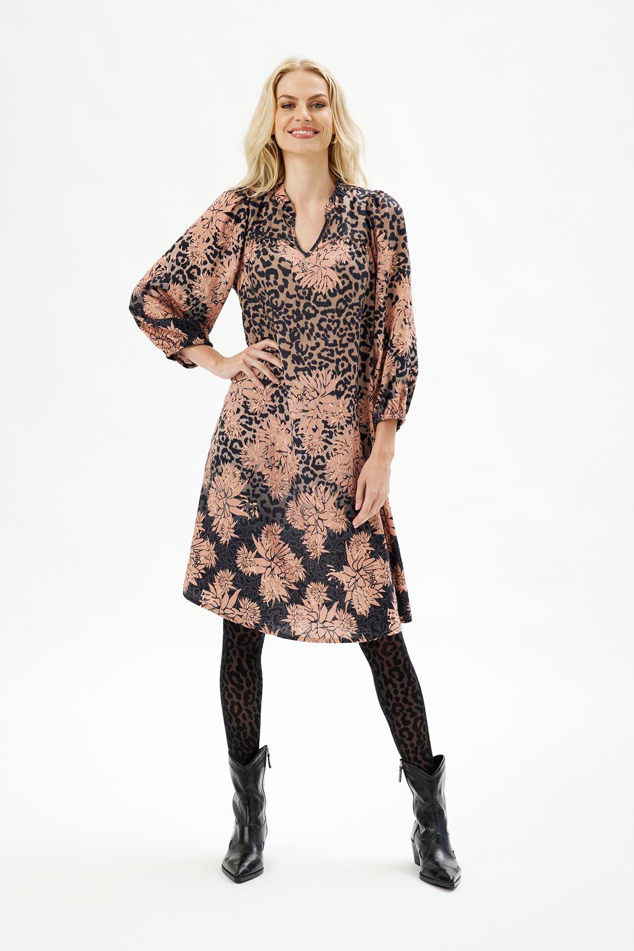 Super flot kjole med print fra IN FRONT i en rummelig pasform. Kjolen har 3/4 ærmer med elastikafslutning, en lille krave, v-halsudskæring samt bærestykke med rynker, både bagpå og foran over brystet. • Thea dress • V udskæring • 3/4 ærmer