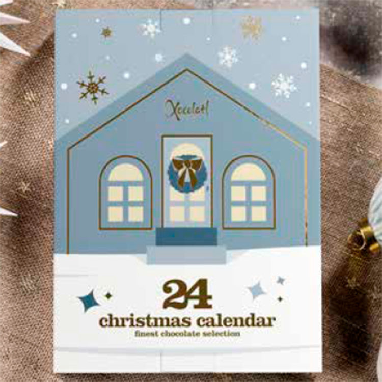 Nyd dagene op til jul med lækker dansk chokolade fra Xocolatl med 24 små fyldte chokolader med fyld af bl.a. appelsin, mint, lakrids, saltkaramel, kokos, citron og fløde. Ca. 125 gram