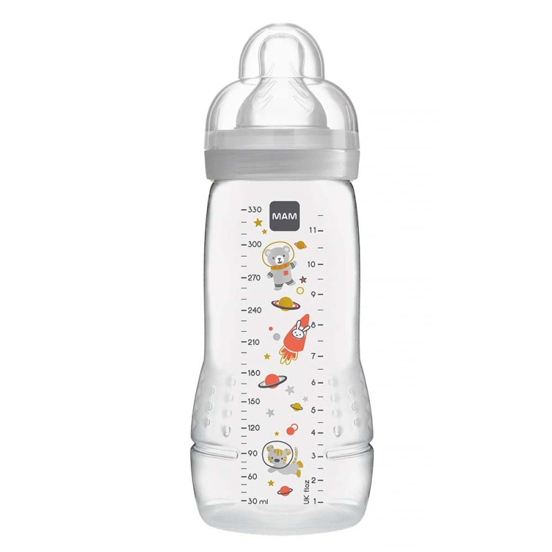 Sød sutteflaske fra MAM. Sutteflaksen kan indeholde 330 ml. og er med en super blød silikone tud. Sutteflasken er nem at holde i for baby og voksen.