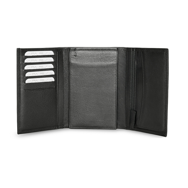 En lækker 3-fløjet herrepung, i blødt sort kalveskind, med plads til masser af kort. Plads til 12 kort og seddelrum i ryggen. Pungen har dobbelt stikninger og møntrummet er med skind og lukkes med lynlås. Kortlommerne er RFID-sikret så di