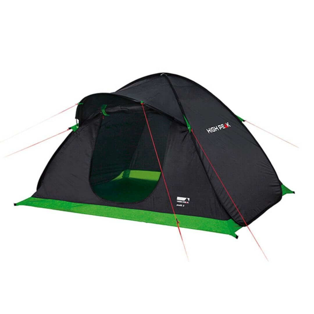 Swift pop-up teltet fra tyske High Peak har plads til 3 personer, og det kan sættes op på ingen tid. Ved opsætning tages teltet blot ud fra opbevaringsposen, og foldes ud. Herefter indsættes blot en enkelt teltstang samt pløkker. Med dette telt sparer du