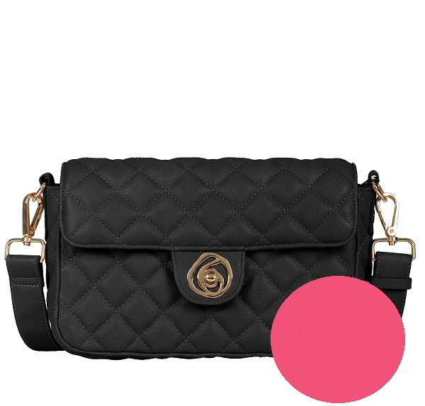 Her får du en lille men rummelig skuldertaske fra Rosemunde, i en frisk fushia-pink med sølvfarvede detaljer. Tasken fremstår stilfuld i et quiltet look og en smuk dekorativ drejelås med Rosemunde logoet. Du finder ét stort rum, med e