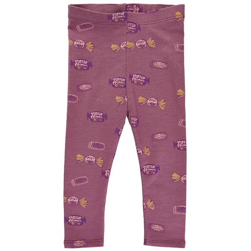 De fine leggings fra Soft Gallery er i en flot mørkerosa farve med print af slik i lilla og guldglimmer. Leggingsene