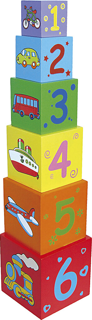 Sæt med 6 stk. trækasser der kan stables til et tårn og puttes inden i hinanden. På kassernes…