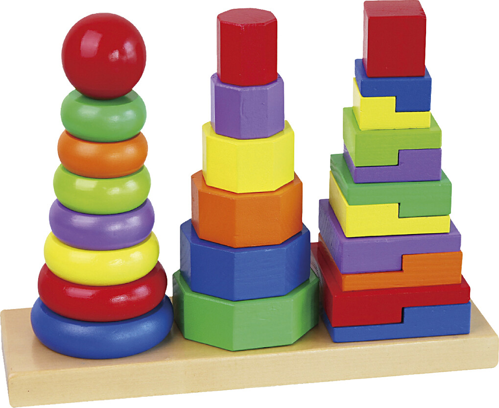 Et anderledes stabeltårn med tre pinde, hvor barnet kan stable tre forskellige tårne med hver sin…