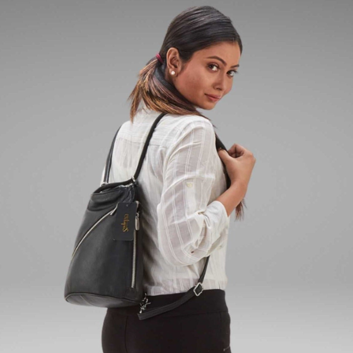 Style Gandhi: Dette er den fedeste lædertaske. Denne smukke og eksklusive taske er en kombineret rygsæk og hånd- og skuldertaske i lækkert kvalitetslæder.  Style Gandhi er designet således, at når tasken bruges som skuldertaske, kan det ikke ses, at